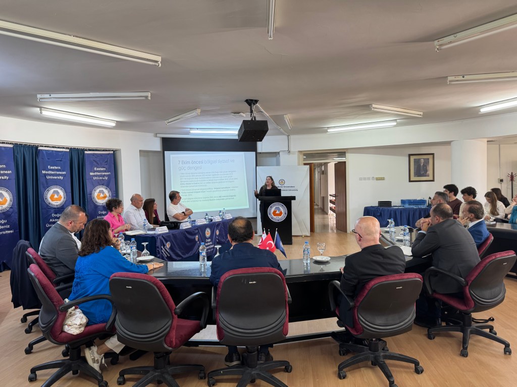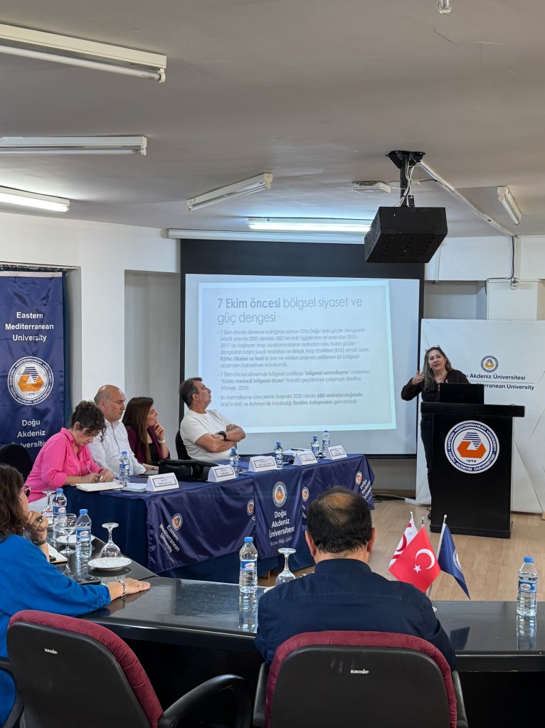 Gazimağusa, 7 Mayıs 2025 – Doğu Akdeniz Üniversitesi (DAÜ) Siyaset ve Uluslararası İlişkiler Araştırma Merkezi (SAM), bölgedeki güncel gelişmelere ışık tutan önemli bir panel etkinliğine ev sahipliği yaptı. “7 Ekim 2023 Sonrası Orta Doğu’da Değişen Dengeler” başlıklı panel, 7 Mayıs 2025 Çarşamba günü saat 14.30’da BEA-5 Amfisi’nde gerçekleştirildi.Panelin moderatörlüğünü DAÜ’den Yrd. Doç. Dr. Gülay Umaner Duba üstlenirken, bölge politikalarını yakından takip eden akademisyenler güncel analiz ve değerlendirmeleriyle dikkat çekti.