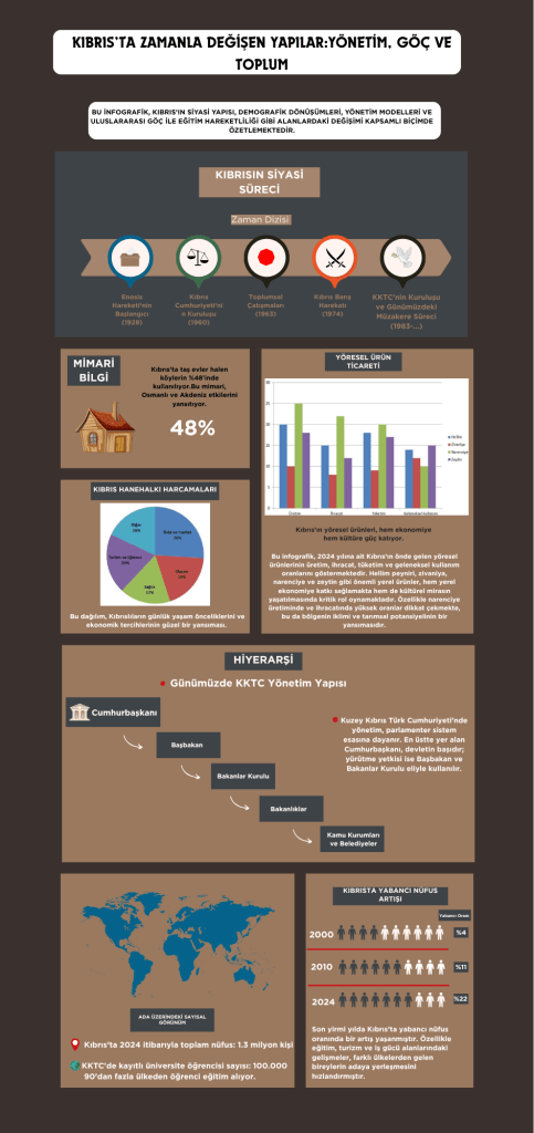 Kıbrıs’ın siyasi yapısından göç hareketlerine, mimariden eğitimdeki uluslararasılaşmaya kadar birçok alandaki dönüşüm, 2024 itibarıyla dikkat çekici boyutlara ulaştı. Toplam nüfusu 1.3 milyonu aşan ada, 100 binden fazla uluslararası öğrenciye ev sahipliği yaparken; yabancı nüfus oranı son 20 yılda %4’ten %22’ye yükseldi.